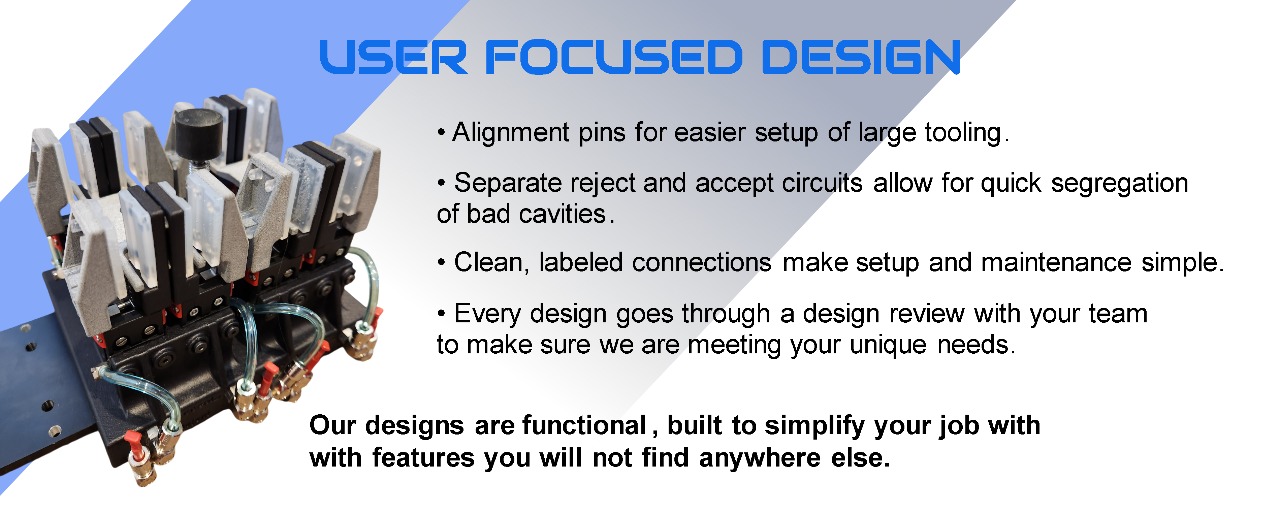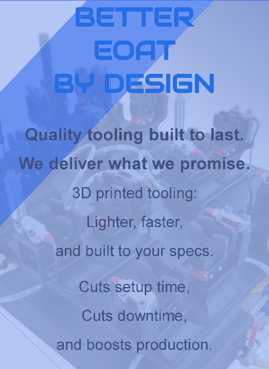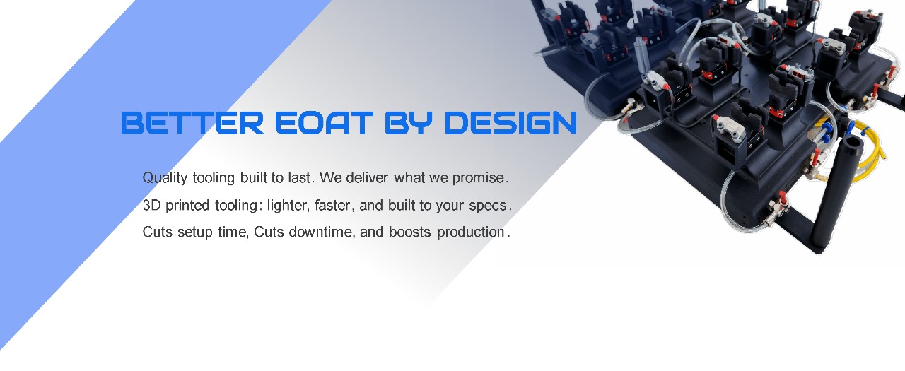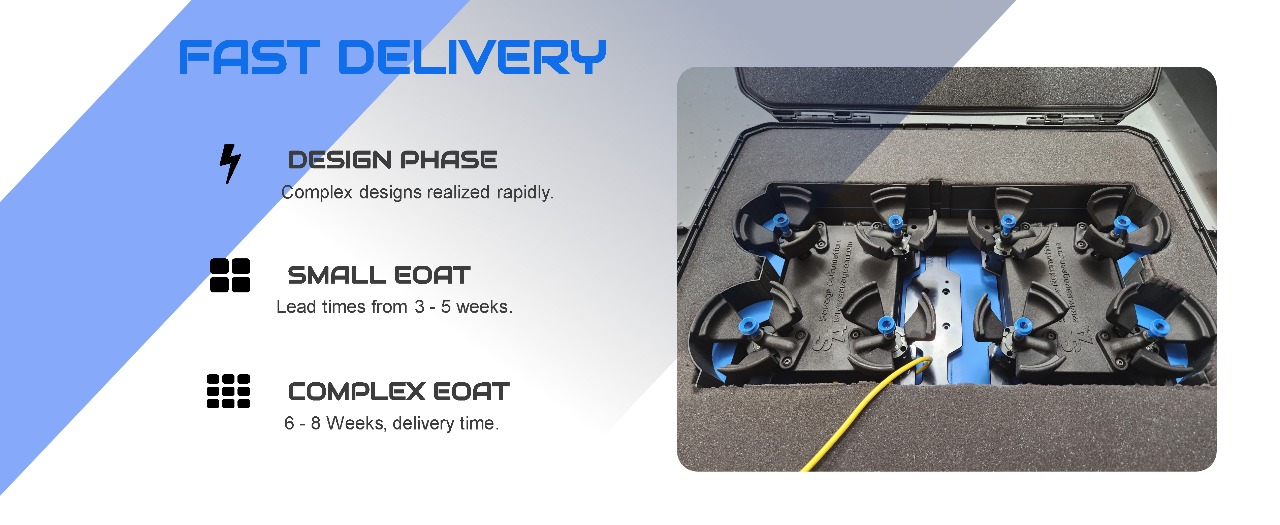 3D printing not only produces lighter and more streamlined tools but also dramatically reduces manufacturing and lead times for spare components. EOAT for 4-8 cavity applications can be completed in as little as 3 weeks.