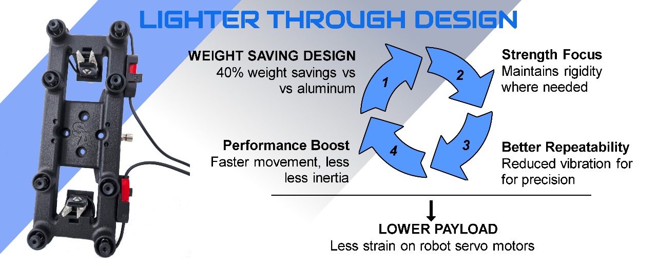 We utilize 3D printing in PA12 (Nylon) to manufacture lighter End Effectors and components without sacrificing strength or durability. This innovative approach not only enhances performance but also protects your tooling. In the event of a crash, the EOAT acts as a sacrificial element, safeguarding your steel components from damage.